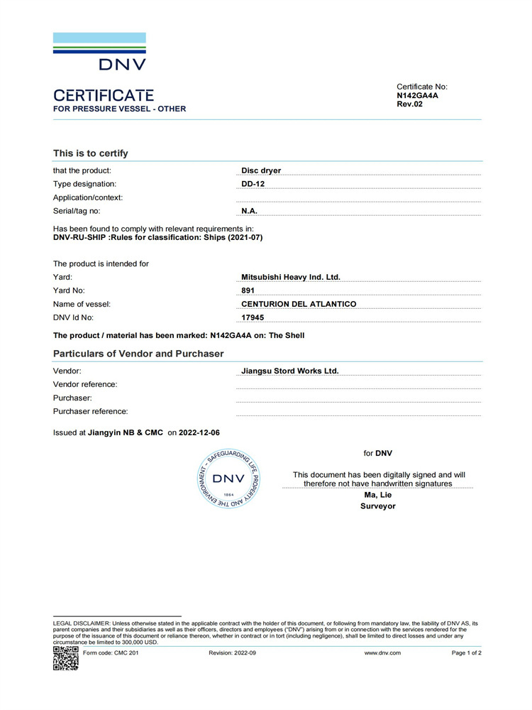 DD-12 圓盤干燥機(jī) DNV 船級社認(rèn)證證書
