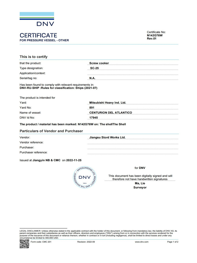 SC-25 蒸煮器 DNV船級社認(rèn)證證書
