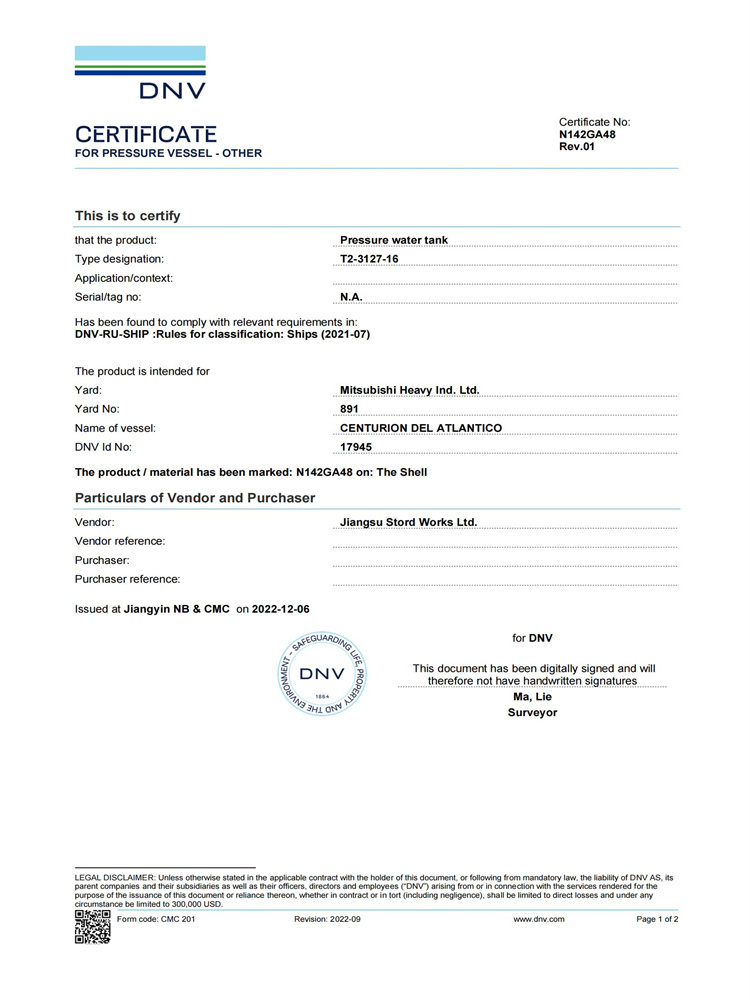不銹鋼壓力罐 DNV船級社認(rèn)證證書