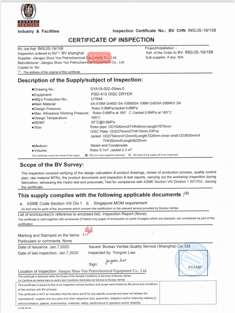 PSD-150 圓盤干燥機(jī) PED Model G證書