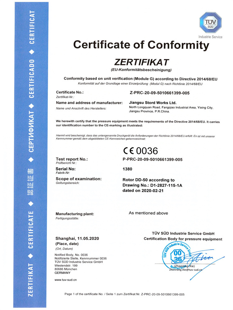 DD-50圓盤干燥機(jī) PED Model G證書